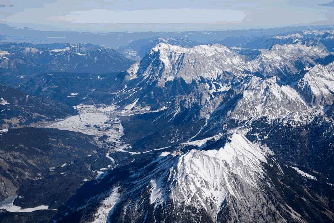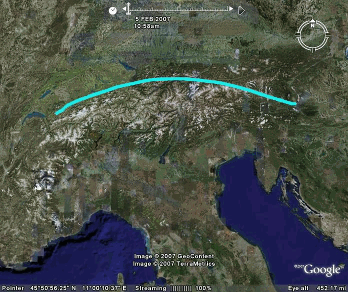 Blick nach Nordosten, die Zugspitze grüßt. Im Norden erkennen wir deutlich den Bodensee. Die Allgäuer Berge liegen in der Sonne und Obersdorf spart offensichtlich dieses Jahr die Schneeräumungskosten. Nur die Großschanzen sind als weiße Punkte in der Landschaft auszumachen. Wir haben mit dem breiten Rheingraben die letzten guten Landemöglichkeiten hinter uns gelassen und befinden uns über Vorarlberg. Die Controlerstimme hat wieder gewechselt. Geblieben ist auch bei dem Herrn in Innsbruck das Problem im Verständnis unserer „Destination: Ljubljana". Die Nord / Süd Drift von Heißluftballonen ist ihm geläufig aber nach Osten? Offensichtlich ist dadurch die mit zweifelndem Unterton gestellte Frage ausgelöst: please confirm typ of Aircraft. Und dies trotz des vorliegenden Flugplanes… Nachdem wir als Heißluftballon identifiziert werden, was er selbst später mit einem Blick aus dem Kontrollturm in Innsbruck zweifelsfrei bestätigen kann, da wir den Platz in Sichtweite überfahren, haben wir wieder eine sehr gute Betreuung. Unter uns sind nun die bekannten Skigebiete in Tirol. Die Pisten erscheinen prächtig präpariert. Die Skifahrer bevölkern Ameisen gleich die hochgelegen Abfahrtsstrecken. Wir fahren unmittelbar am Großglockner vorbei.