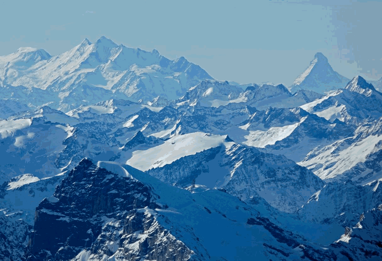 Über Engelberg, mit Titlis im Vordergrund. Rechts im Hintergrund das 60 km entfernte Matterhorn